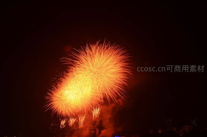 一团炽热的橙色烟花在漆黑的夜空中猛烈爆发,光芒万丈,温暖而热烈,为夜晚带来震撼人心的视觉冲击。