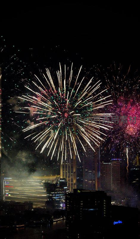 绚丽的烟花在现代都市的摩天大楼之间腾空而起,五彩斑斓的光芒与城市灯光交织,共同谱写一曲繁华都市的节日赞歌。