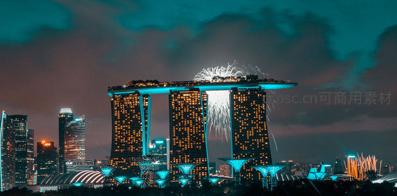 新加坡滨海湾金沙酒店上空燃放璀璨烟花,现代摩天大楼与绚烂焰火交相辉映,展现都市节日庆典的壮丽景象。