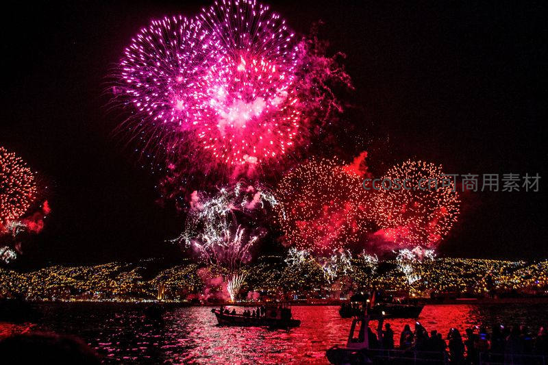 绚丽多彩的烟花在夜空中绽放,映照在水面上,与城市灯火交相辉映,营造出喜庆热闹的节日氛围。