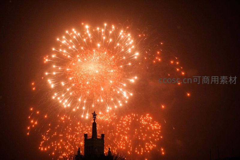 炽热的橙色烟花在古老塔楼的上空绽放,金光四射,将历史建筑的轮廓映衬得庄重而辉煌,充满节日的神圣感。