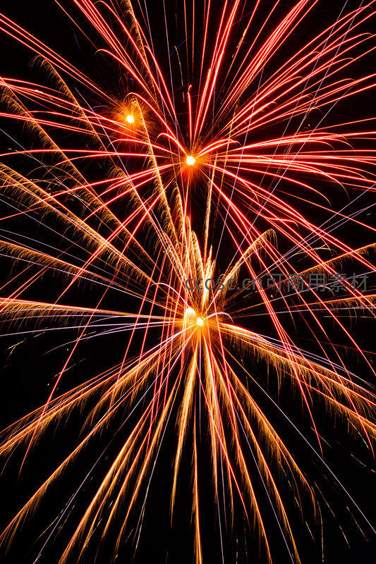 深邃夜空中,红色烟花如花朵般绚烂绽放,光轨交织成壮丽画卷,照亮了整个天际。