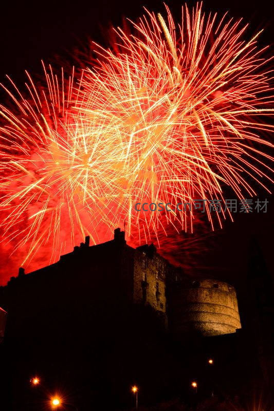 古堡夜空绽放绚烂烟花