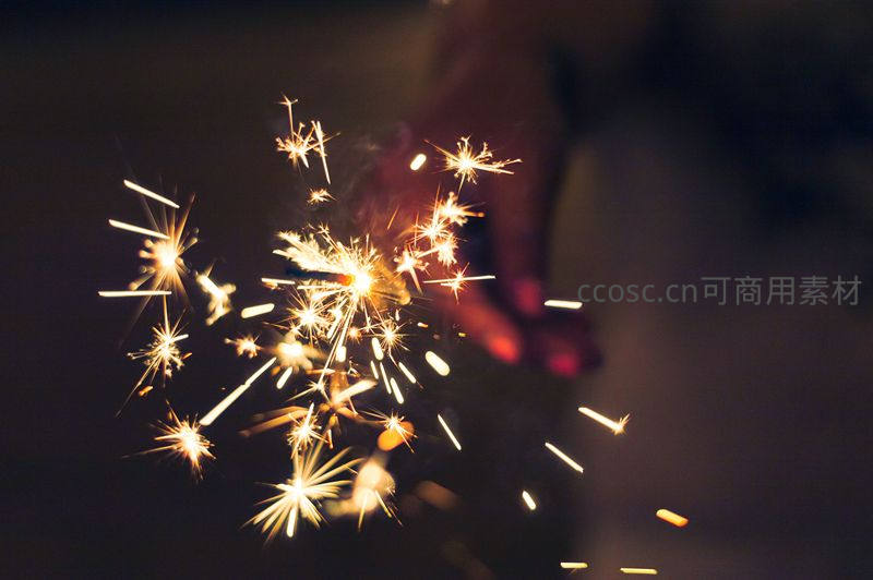 一只手紧握着正在燃烧的火花棒,金色的火星四溅,在模糊的暗色背景中显得格外耀眼和温暖。