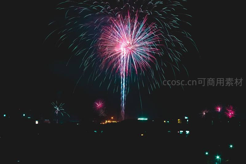 在漆黑的夜幕中,一朵巨大的彩色烟花轰然绽放,光芒四射,照亮了寂静的夜空。