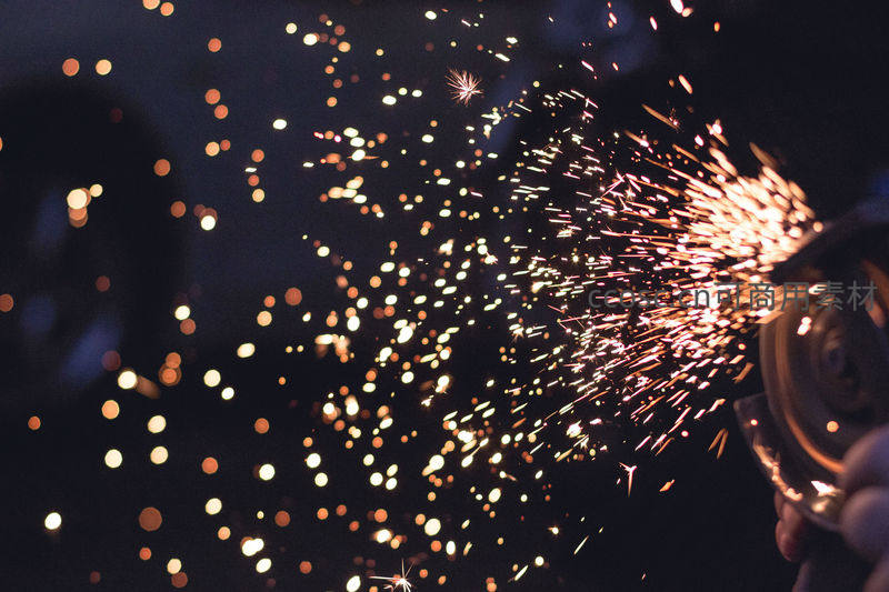 近距离捕捉打磨机高速旋转时迸发出的炽热金色火花,展现了工业生产中充满力量与动感的瞬间。