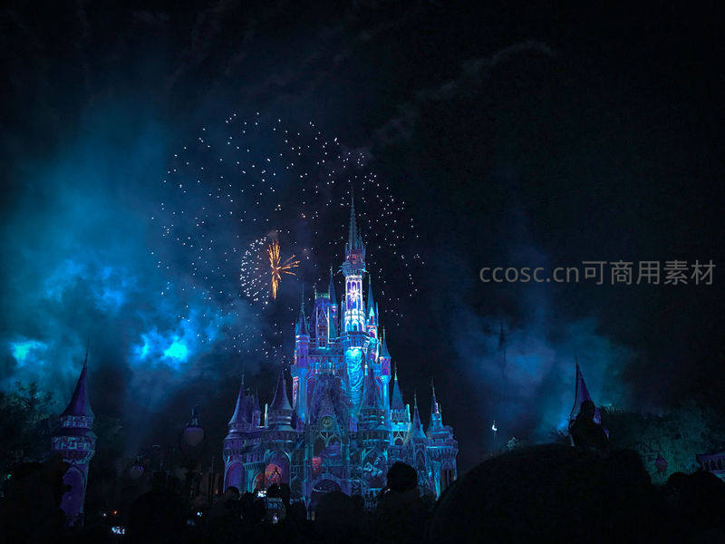 一座宏伟的童话城堡在夜色中被蓝色灯光点亮,绚丽的烟花在它上空绽放,为现场观众带来一场如梦似幻的视觉盛宴。