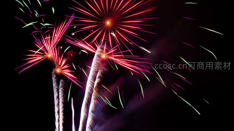 夜空中绽放的红色放射状烟花