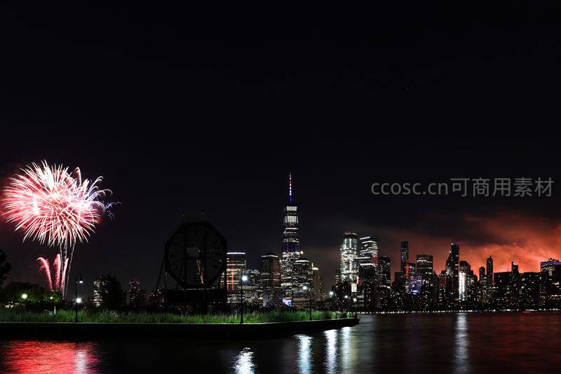 在曼哈顿标志性的天际线下,烟花在夜空中绽放,水面倒映着城市的灯火与烟花的绚烂色彩。