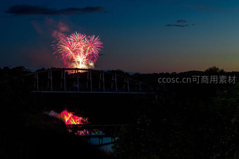 绚丽的烟花在桥上空绽放,其光芒倒映在平静的水面上,与周围的树木和暮色构成一幅宁静而壮观的节日画卷。