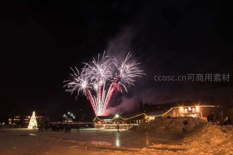 雪地圣诞树旁的烟花