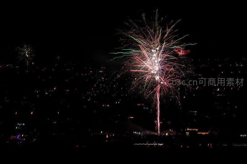从高处俯瞰,五彩斑斓的烟花在城市的万家灯火之上绚丽绽放,为静谧的夜晚增添了无尽的活力与节日的喜悦。