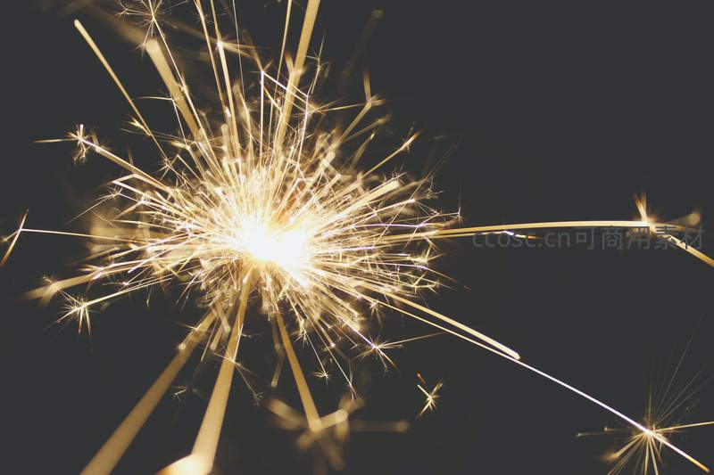 在漆黑背景中,一根烟花棒绽放出璀璨金色火花,光芒四射,营造出热烈而梦幻的节日氛围。