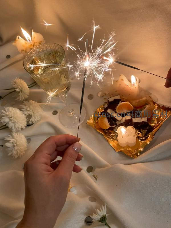 洁白桌布上,手握烟花棒轻触蛋糕与香槟杯,烛光摇曳,火花飞舞,营造温馨浪漫的生日庆祝时刻。
