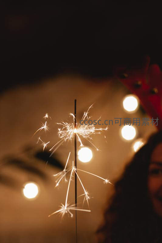 在温暖的灯光下,一支燃烧的烟花棒闪耀着细碎光芒,背景虚化的人影与灯串营造出温馨节庆氛围。