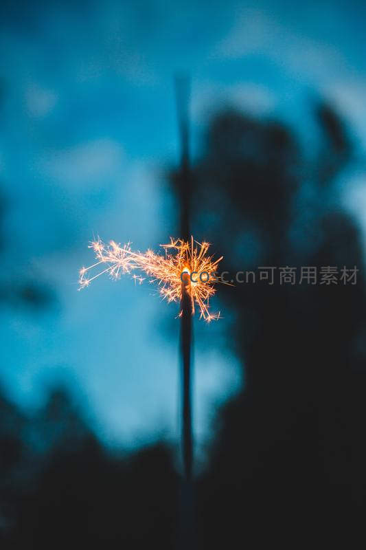 深蓝夜幕中,一支烟花棒在虚化树影前静静燃烧,橙色火花与冷色背景形成强烈对比,充满诗意与静谧感。