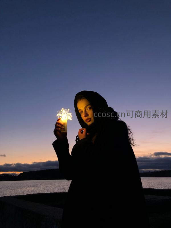 夕阳西下,一位身披斗篷的女孩站在湖边,手中烟花棒点亮了渐暗的天际,柔和光线勾勒出她沉静的轮廓。