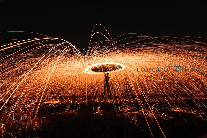 黑暗旷野中,一人挥舞钢丝绒创造出巨大的橙色光环与放射光束,宛如舞者在夜空中绘制流动的火焰艺术作品。