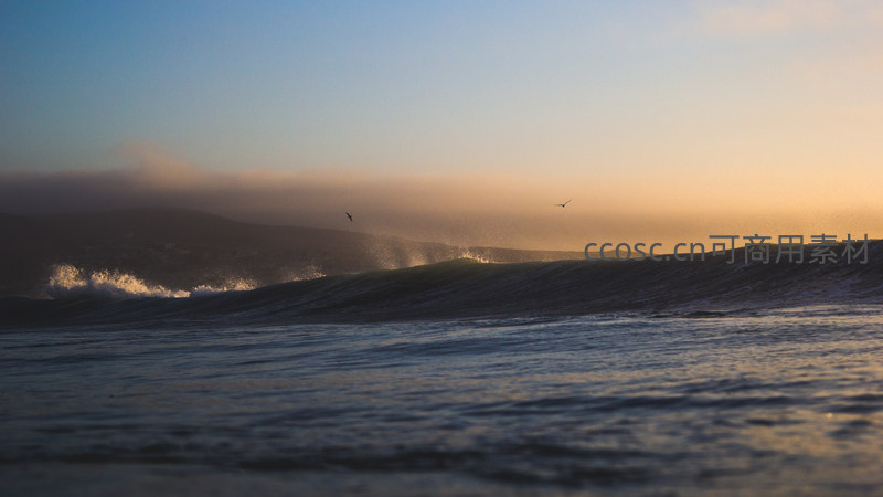 夕阳西下,金色的光芒洒在翻滚的海浪上,远方山峦与飞鸟剪影相映成趣,展现出大自然无与伦比的壮阔与宁静。