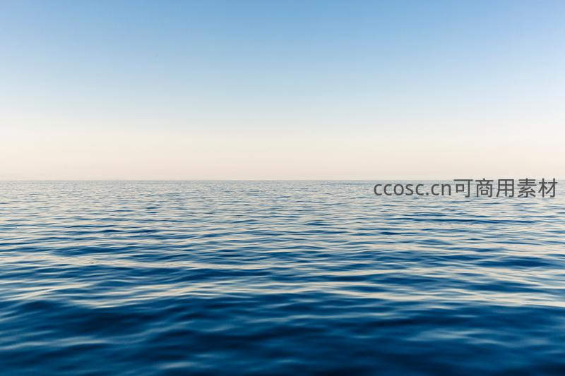 清晨柔和的光线轻抚着平静的蓝色海面,微小的波纹荡漾,营造出一种安宁祥和的氛围。
