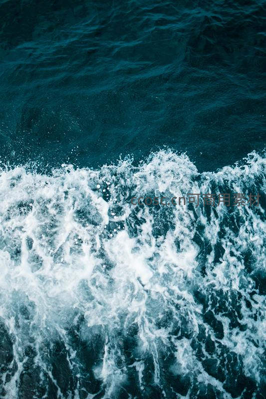 从高处俯瞰深蓝色的海水,汹涌的浪花拍打形成洁白泡沫,水纹交错,展现出海洋澎湃的力量与动态美感。