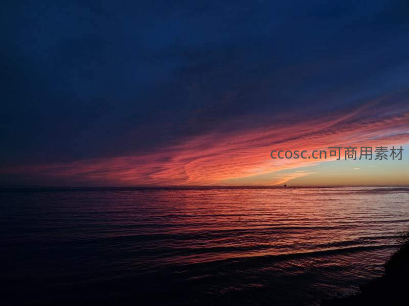 夕阳西下,绚烂的橙红霞光铺满天际,将平静的海面染成一片温暖的色彩,远方孤舟点缀如诗如画。