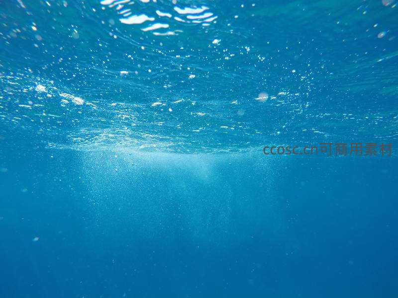 置身于幽蓝的水下世界,阳光穿过水面形成道道光柱,无数细小气泡缓缓上升,带来宁静与神秘感。