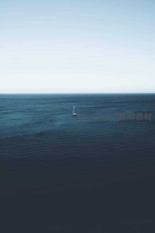 一艘孤帆静泊于广阔无垠的深蓝海面,天水相接,画面极简而富有诗意,传递孤独与自由之感。