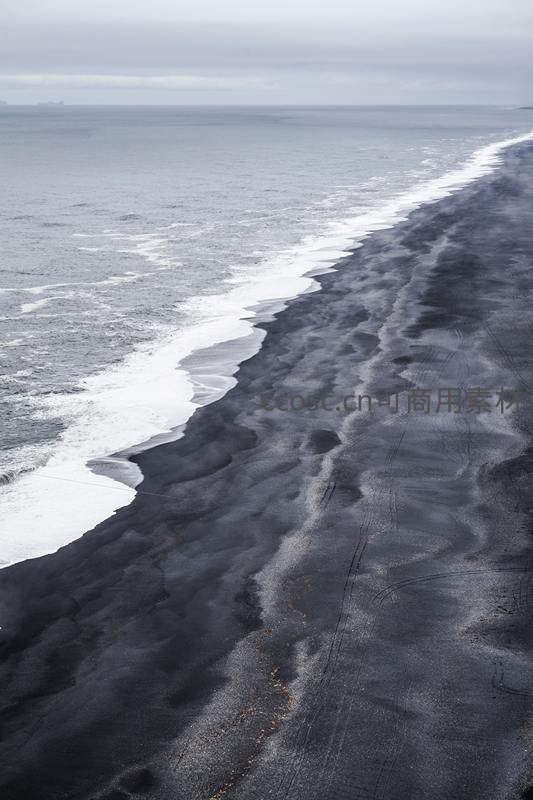 从高空俯瞰,黑色的火山沙与洁白的浪花形成鲜明对比,蜿蜒的海岸线勾勒出独特的自然地貌,宁静而壮观。