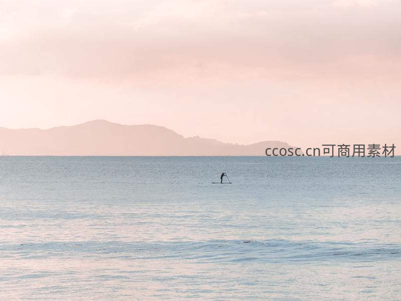 在粉橙色的暮色中,一个孤独的桨板者划行于平静的海面,远方是朦胧的山峦剪影,享受着与自然融为一体的宁静时光。