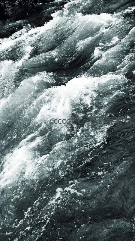 汹涌的水流在黑白对比中展现出原始的力量感,飞溅的水花与岩石碰撞,充满视觉张力和节奏感。
