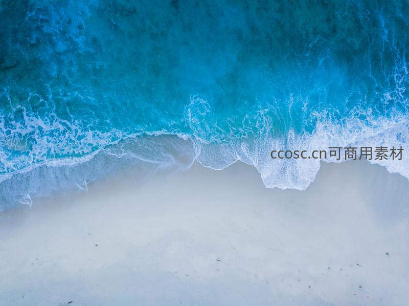 从高空俯瞰,碧蓝色的海水与洁白细腻的沙滩交界,层层海浪温柔拍打岸边,构成一幅清新治愈的海岸画卷。