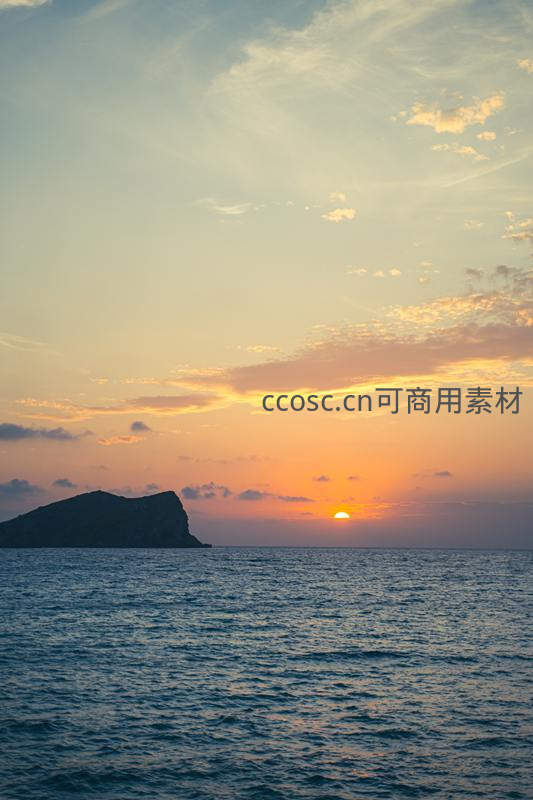 夕阳西下,金色的阳光洒在平静的海面上,远处的孤岛轮廓清晰,天空被染成温暖的橙红色,构成一幅宁静壮丽的自然画卷。