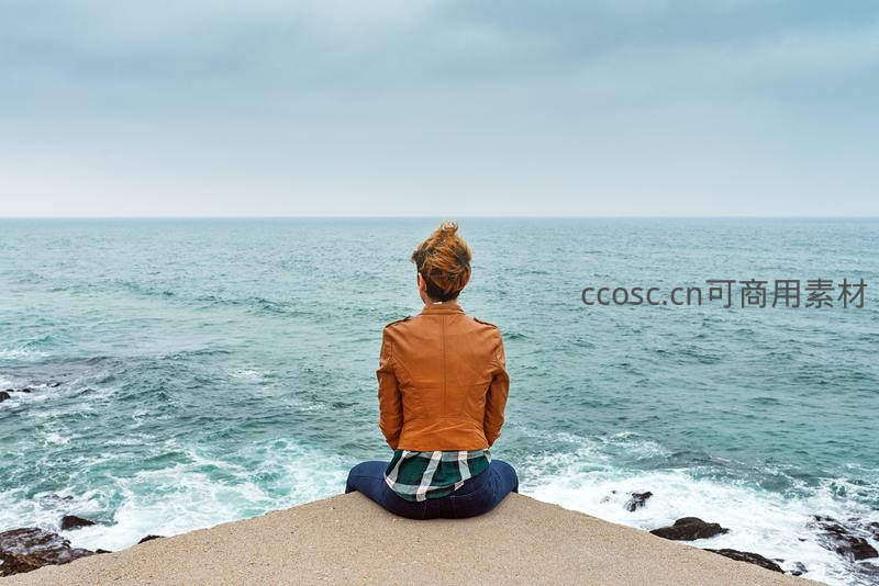 女子独坐崖边,凝望浩瀚大海,思绪万千