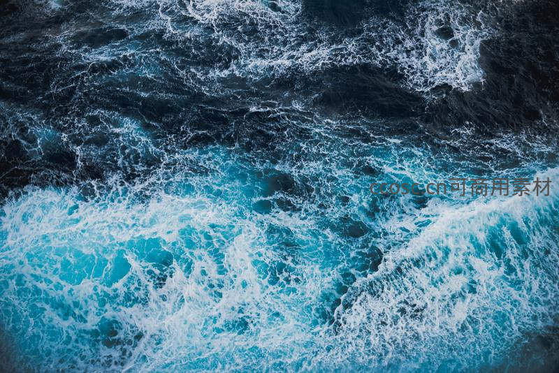从高空俯瞰,深邃的蓝色海面被狂野的浪花撕裂,洁白的泡沫如雪般铺展,展现大自然原始的力量与壮美。
