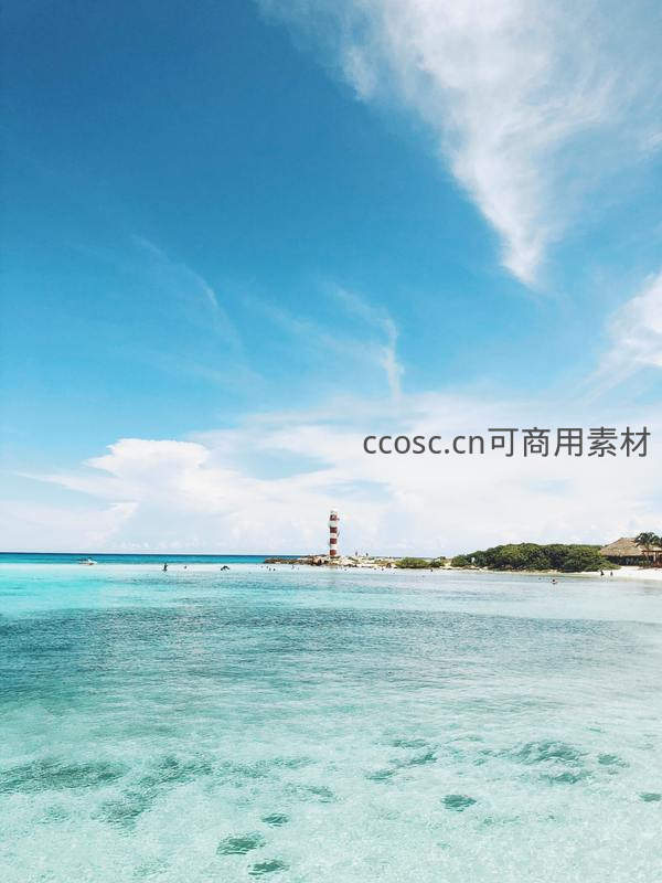 湛蓝天空下,红白相间的灯塔矗立在海岸线,清澈海水轻抚沙滩,营造出宁静悠远的海滨氛围。