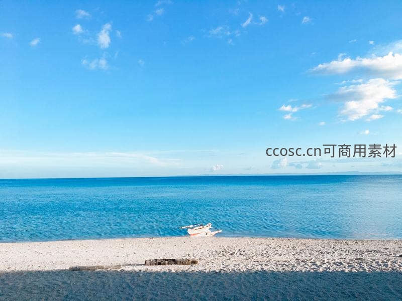 无垠碧海与澄澈蓝天相接,洁白沙滩上一叶孤舟静静停泊,远处云卷云舒,传递着极致的宁静与自由。