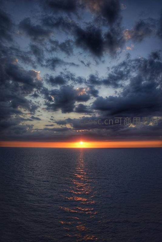 金色的夕阳从厚重云层的缝隙中穿透而出,将万丈光芒洒向无垠海面,形成一条耀眼的光路,景色恢弘壮丽。