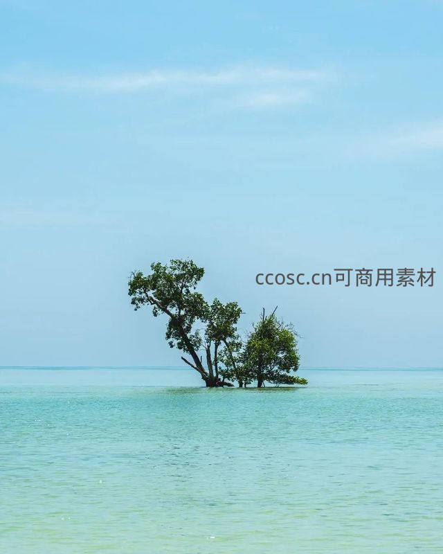 一棵茂盛的树木独自矗立在清澈见底的浅海中,与湛蓝天空相映,营造出超现实般的诗意美感。