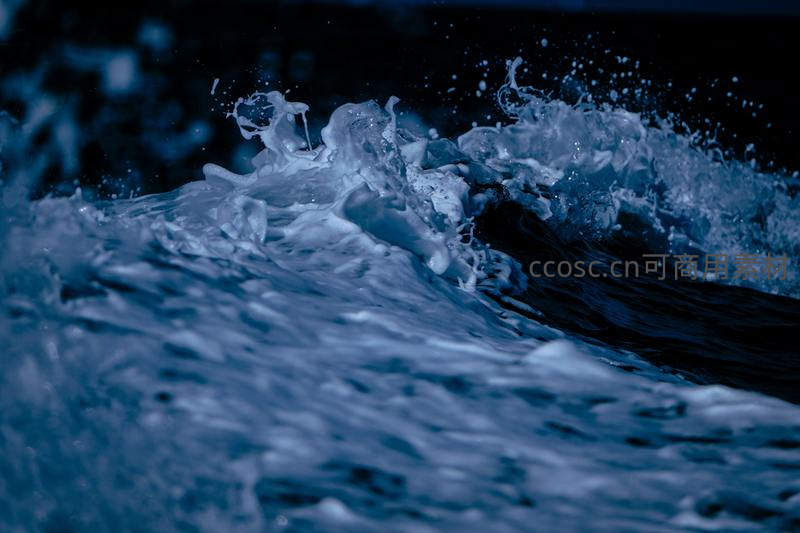 微距镜头捕捉深蓝色海浪翻涌飞溅的刹那,水珠四散,泡沫翻腾,展现了海洋澎湃不息的原始力量与动感之美。
