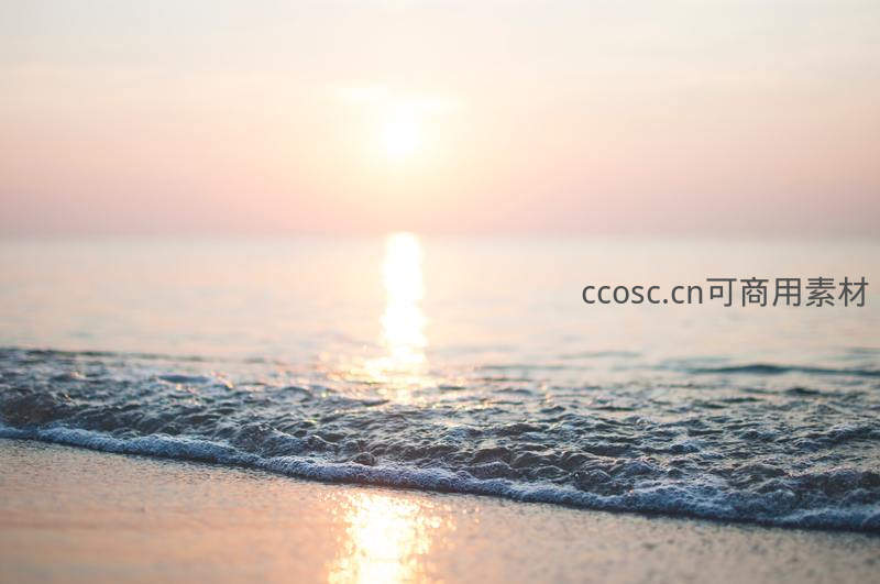 柔和的夕阳余晖洒在湿润的沙滩上,细小的浪花轻轻退去,水面与沙粒反射着金色光芒,营造出温馨浪漫的黄昏意境。