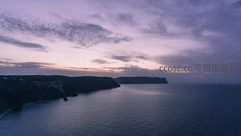 从高空俯瞰,壮丽的海岸线在紫红色晚霞中延伸,平静的海面与起伏的山峦构成一幅宁静画卷。