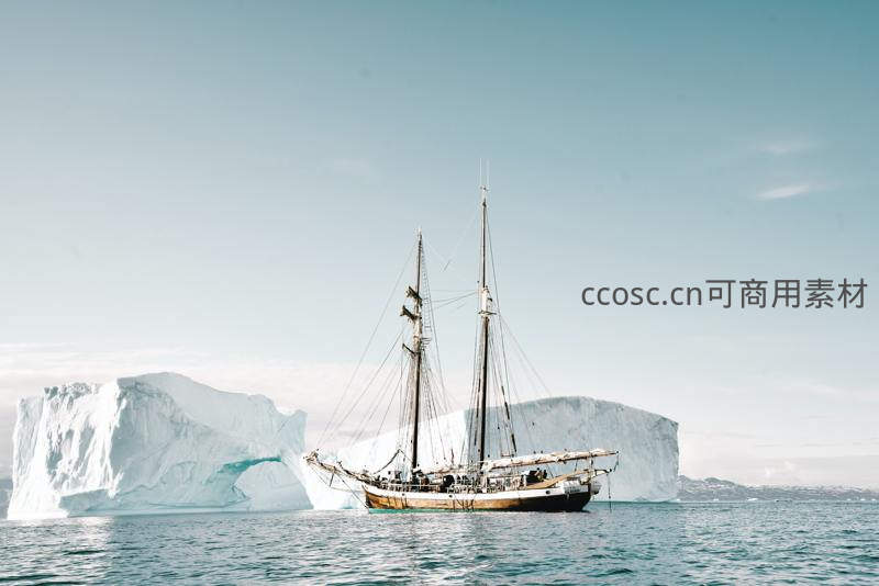 一艘古典帆船静泊于巨大冰山旁,蔚蓝海面映衬着纯净天空,展现人与自然的和谐与壮阔。