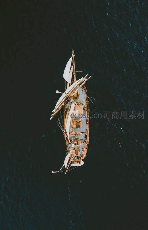 从高空俯瞰,一艘扬帆的古帆船如艺术品般漂浮在深邃海面上,展现航海的优雅与自由。