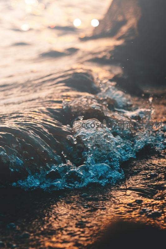 夕阳下海浪拍打岩石的微距瞬间