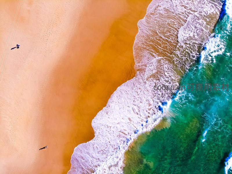 从高空俯瞰,金黄沙滩与碧绿海水被洁白浪花清晰分隔,形成天然的抽象画作,展现大自然鬼斧神工的视觉美感。