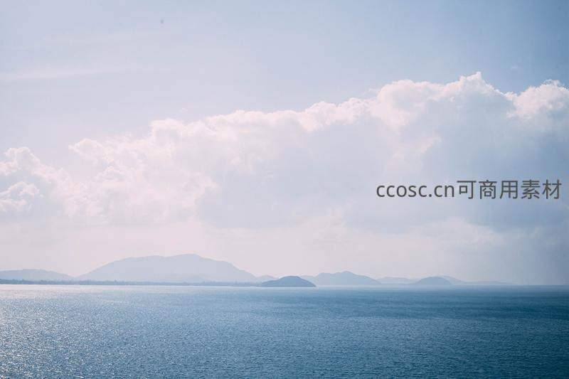 湛蓝的海面与纯净的天空相接,朵朵白云悠然飘浮,远方岛屿若隐若现,构成一幅令人心旷神怡的开阔海景画卷。