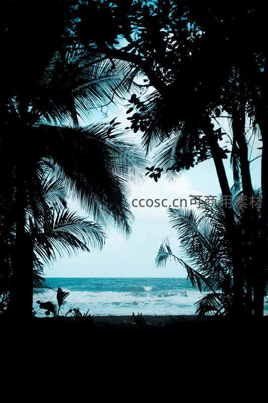 通过浓密椰树的黑色剪影框架,望向远方翻滚的白色浪花与湛蓝海面,营造出一种神秘而宁静的热带海滨度假氛围。