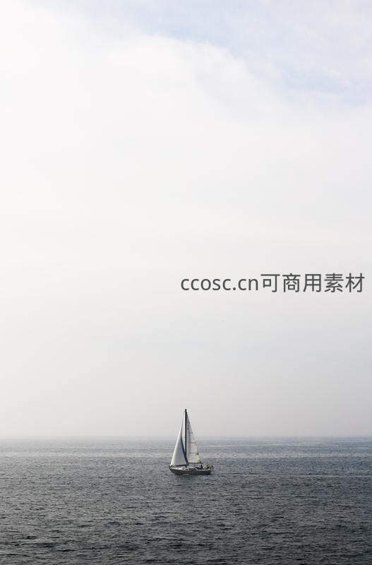 一艘白色帆船独自航行在广阔无垠的灰蓝色海面上,头顶是空旷的天空,整个画面简洁而富有诗意,象征着自由与探索。