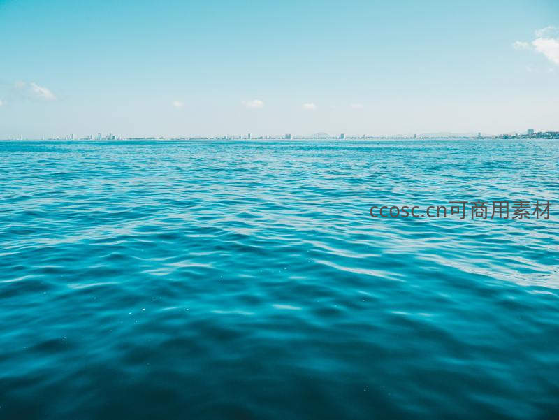近处是微波荡漾的碧蓝海水,远方地平线上隐约可见现代化城市的高楼轮廓,自然与都市在此交汇。